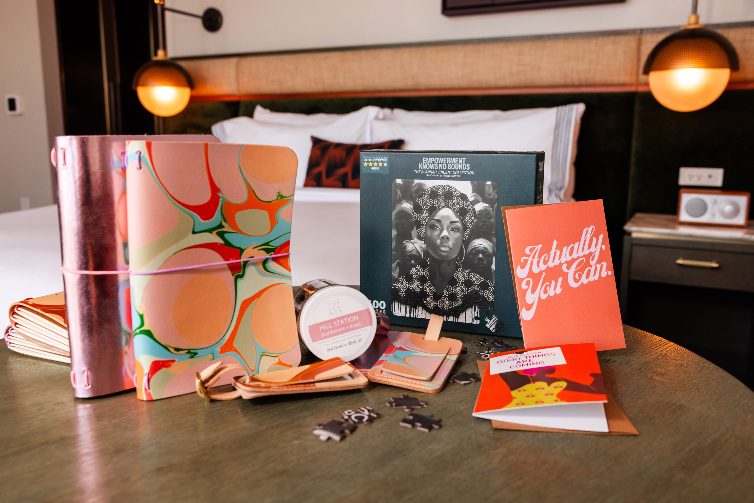 Thanks to curated amenities from female-founded brands, tapping into your creativity right from your room has never been easier. Puzzles from Dope Pieces invite you to unwind while engaging your mind with vibrant designs that foster patience and big-picture thinking. The handcrafted leather journals and luggage tags from Glad & Young Studio encourage moments of reflection and intention-setting, offering a stylish way to document your thoughts and experiences.